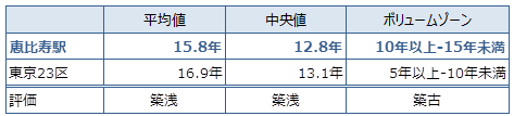 恵比寿の築年数のボリュームゾーンは、築10年から15年です。