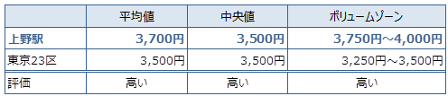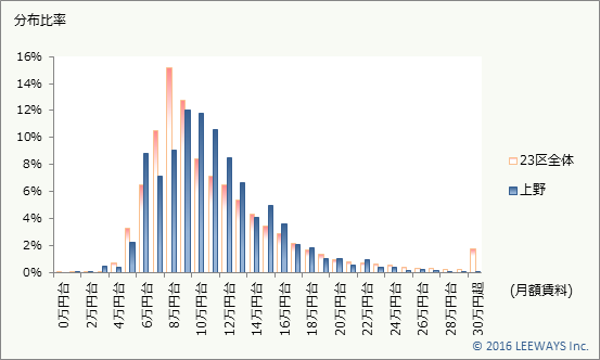 東京23区の賃料のボリュームゾーンが8万円から9万円であるのに対して、上野の賃料ボリュームゾーンの水準はやや高い傾向があります。