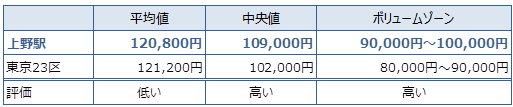 東京23区の賃料の平均が121,200円であるのに対して、上野の賃料平均の水準はやや低い傾向があります。