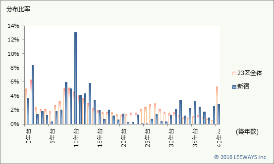 新宿の築年数のボリュームゾーンは、築10年から15年です。