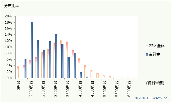 吉祥寺の賃料単価のボリュームゾーンは、2,000円から2,250円です。