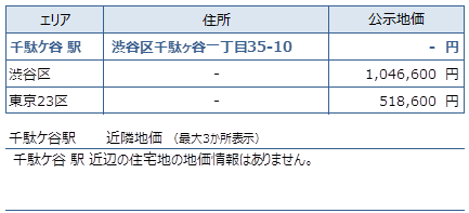 千駄ケ谷のある渋谷区の公示地価は1,046,600円、東京23区の公示地価は518,600円です。千駄ケ谷の公示地価は比較ができません。