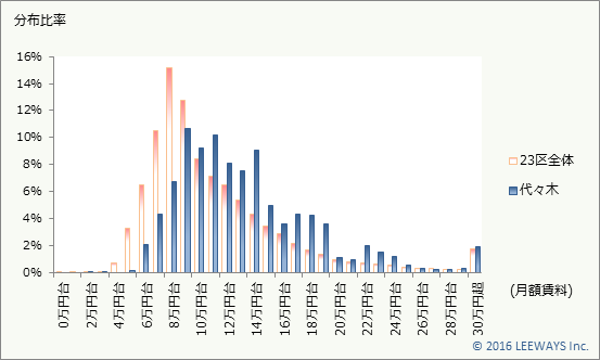 東京23区の賃料のボリュームゾーンが8万円から9万円であるのに対して、代々木の賃料ボリュームゾーンの水準はやや高い傾向があります。