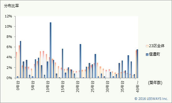 信濃町の築年数のボリュームゾーンは、築10年から15年です。