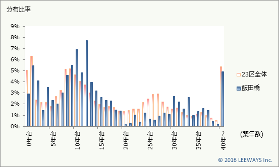 飯田橋の築年数のボリュームゾーンは、築10年から15年です。