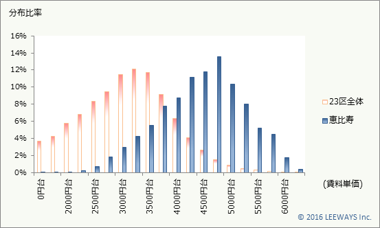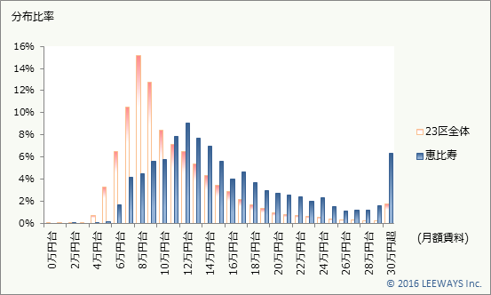 東京23区の賃料のボリュームゾーンが8万円から9万円であるのに対して、恵比寿の賃料ボリュームゾーンの水準は高い傾向があります。