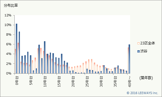 渋谷の築年数のボリュームゾーンは、築5年未満です。