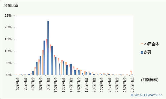 東京23区の賃料のボリュームゾーンが8万円から9万円であるのに対して、赤羽の賃料ボリュームゾーンの水準は同じくらいです。