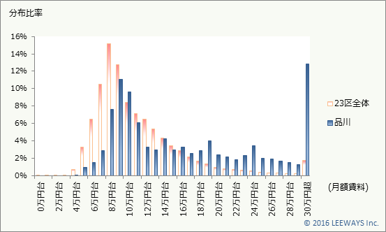 東京23区の賃料のボリュームゾーンが8万円から9万円であるのに対して、品川の賃料ボリュームゾーンの水準はとても高い水準です。