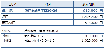 品川のある港区の公示地価は1,475,400円、東京23区の公示地価は518,600円です。品川の公示地価は東京23区に対して高いものの、港区に対しては低い水準です。