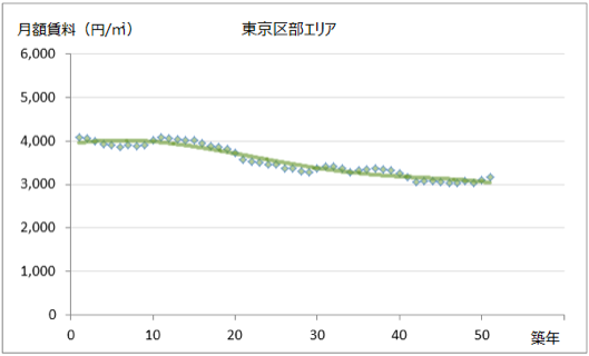 傾向としては、築10年までは賃料はおおむね横ばい、それ以降の築30年までは緩やかに低下し、築40年を超えるあたりから下げ止まりが見られます。