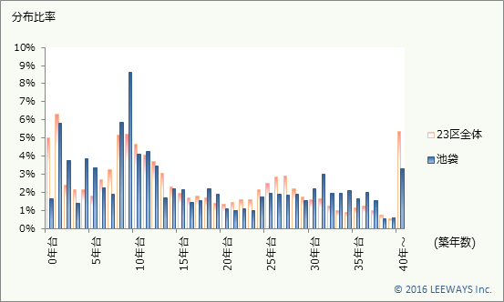 池袋の築年数のボリュームゾーンは、築5年から10年です。