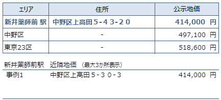 新井薬師前のある中野区の公示地価は497,100円、東京23区の公示地価は518,600円です。新井薬師前の公示地価は東京23区と中野区のどちらに対しても低い水準です。