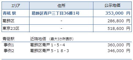 青砥のある葛飾区の公示地価は286,800円、東京23区の公示地価は518,600円です。青砥の公示地価は東京23区に対して低いものの、葛飾区に対しては高い水準です。