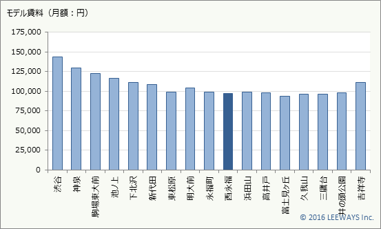 東京23区の賃料の平均が121,200円であるのに対して、西永福の賃料平均の水準はやや低い傾向があります。