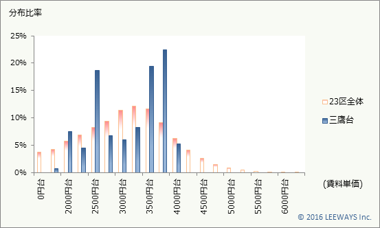 東京23区の賃料のボリュームゾーンが3,250円から3,500円であるのに対して、賃料単価のボリュームゾーンの水準は高い傾向があります。