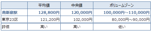 東京23区の賃料のボリュームゾーンが8万円から9万円であるのに対して、南新宿の賃料ボリュームゾーンの水準は高い傾向があります。