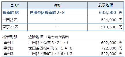 桜新町のある世田谷区の公示地価は534,900円、東京23区の公示地価は518,600円です。桜新町の公示地価は東京23区と世田谷区のどちらに対しても高い水準です。