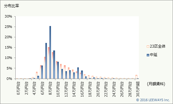 東京23区の賃料のボリュームゾーンが8万円から9万円であるのに対して、中延の賃料ボリュームゾーンの水準は同じくらいです。