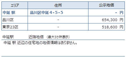 中延のある品川区の公示地価は654,300円、東京23区の公示地価は518,600円です。中延の公示地価は比較ができません。