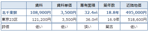 東京23区の賃料の平均が121,200円であるのに対して、北千束の賃料平均の水準は低い傾向があります。