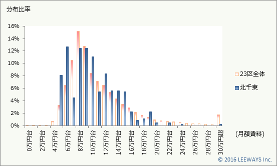 東京23区の賃料のボリュームゾーンが8万円から9万円であるのに対して、北千束の賃料ボリュームゾーンの水準は低い傾向があります。