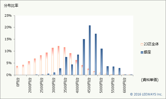 東京23区の賃料のボリュームゾーンが8万円から9万円であるのに対して、銀座の賃料ボリュームゾーンの水準は高い傾向があります。