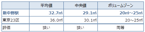 新中野の専有面積のボリュームゾーンは、20㎡から25㎡です。
