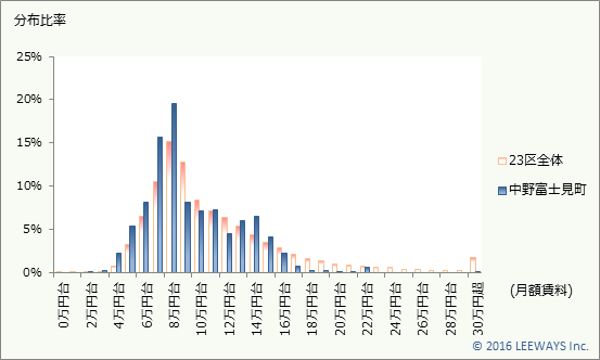 東京23区の賃料のボリュームゾーンが8万円から9万円であるのに対して、中野富士見町の賃料ボリュームゾーンの水準は同じくらいです。