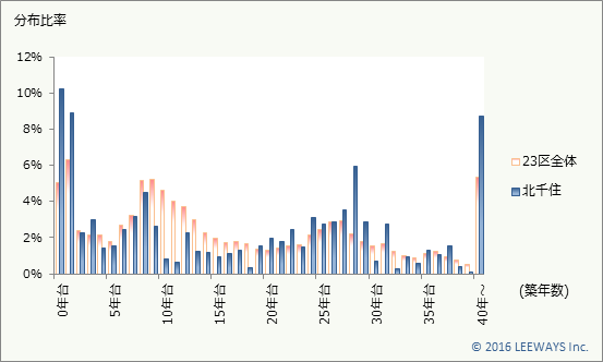 北千住の築年数のボリュームゾーンは、築5年未満です。