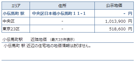 小伝馬町のある中央区の公示地価は1,013,900円、東京23区の公示地価は518,600円です。小伝馬町の公示地価は比較ができません。