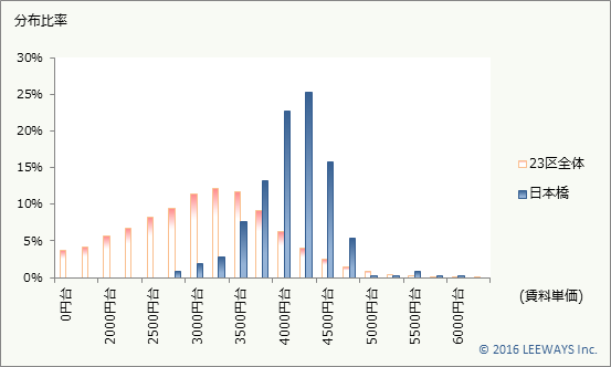日本橋の賃料単価のボリュームゾーンは、4,250円から4,500円です。