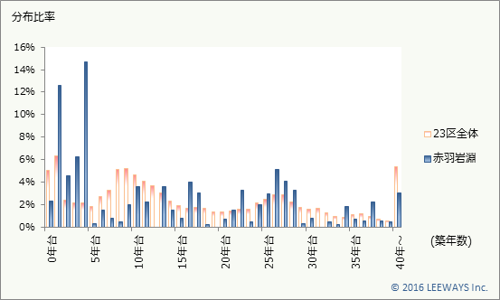 赤羽岩淵の築年数のボリュームゾーンは、築5年未満です。