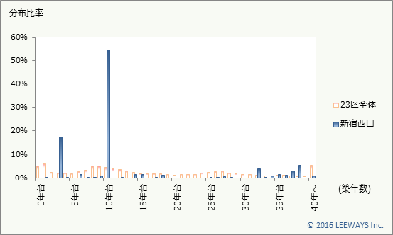 新宿西口の築年数のボリュームゾーンは、築10年から15年です。