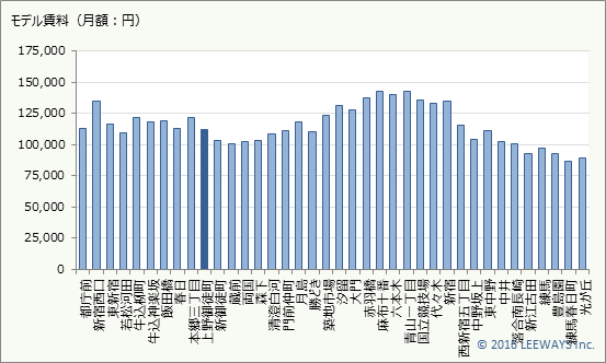 東京23区の賃料の平均が121,200円であるのに対して、上野御徒町の賃料平均の水準は低い傾向があります。