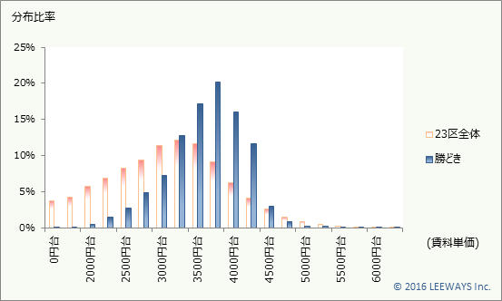 東京23区の賃料のボリュームゾーンが3,250円から3,500円であるのに対して、賃料単価のボリュームゾーンの水準は高い傾向があります。