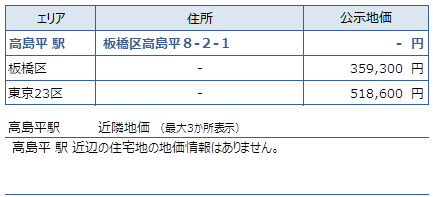 高島平のある板橋区の公示地価は359,300円、東京23区の公示地価は518,600円です。高島平の公示地価は比較ができません。