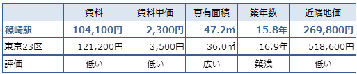 東京23区の賃料の平均が121,200円であるのに対して、篠崎の賃料平均の水準は低い傾向があります。