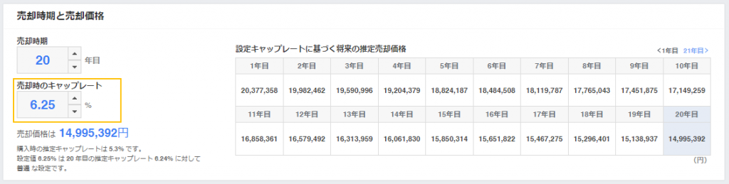 将来の還元利回り(キャップレート)は、空室や経費を考慮する前の賃料に対する利回りです。将来時点の予想表面利回りの水準です。事例では6.25%です。