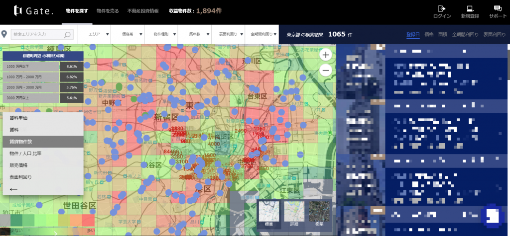 緑色や青色のエリアのもうひとつは東京周辺部です。東京郊外や千葉、埼玉、神奈川県で戸建ての多いエリアと言えます。このエリアでの不動産投資は、物件価格が低いことから表面利回りが高くなりがちです。しかし、空室のリスクは高めとなりますので、Gate.で空室リスクまでを含んだ「全期間利回り」を参考にして、リスク見合いでの利回りを慎重に考慮して投資を判断すべきエリアと言えます。