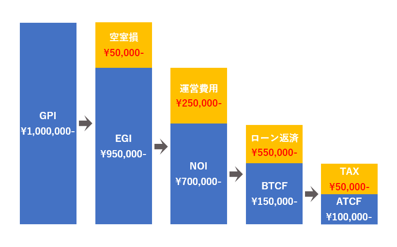 税引前キャッシュフロー(BTCF)とは 、運営純収益(NOI)からローン返済額( ADS )を控除して計算されます。税金を支払う前の手残り額のことです。