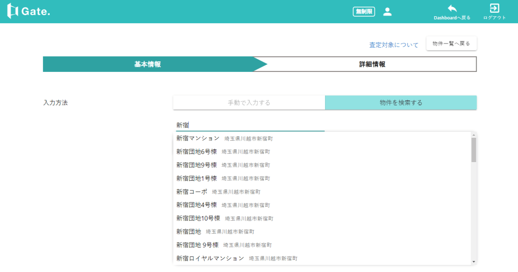 「Gate.」では、査定物件を登録する際に建物名(アパート・マンション名)の一部を入力すると、入力部分を含む建物名が候補として表示されます。