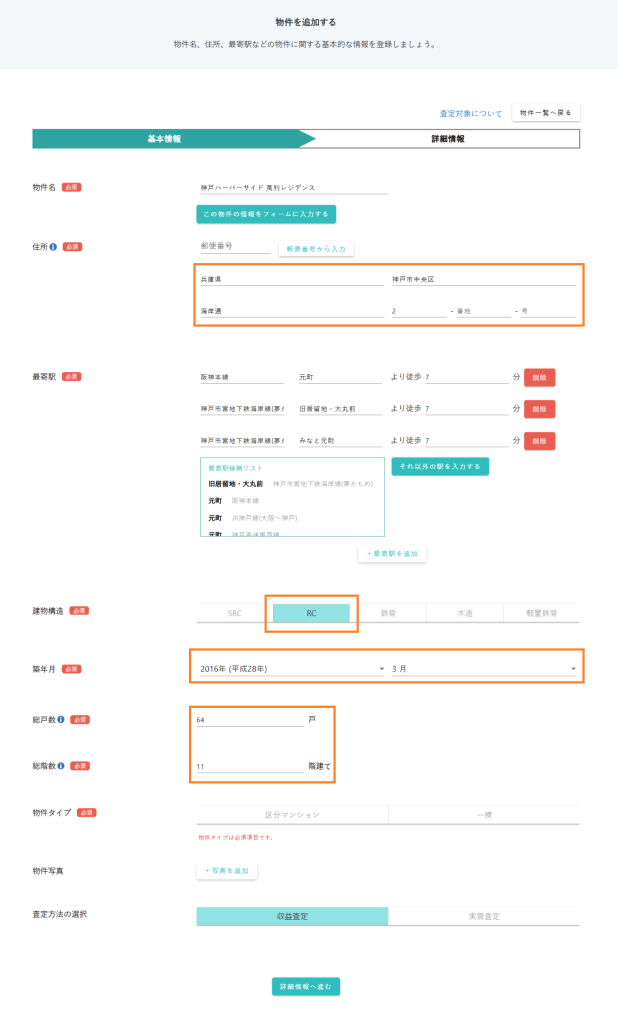 住所・建物構造・築年月・総戸数・総階数などの基本情報が反映されます。