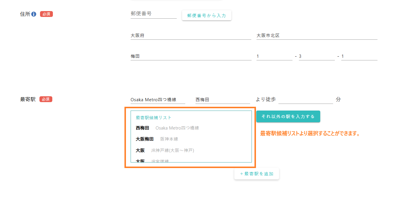 最寄駅の候補が表示されるので、リストより選択することができます。