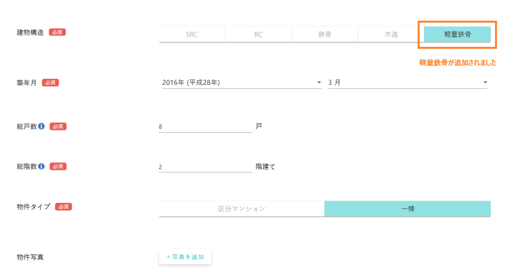 物件登録の建物構造に「軽量鉄骨」が追加されました。