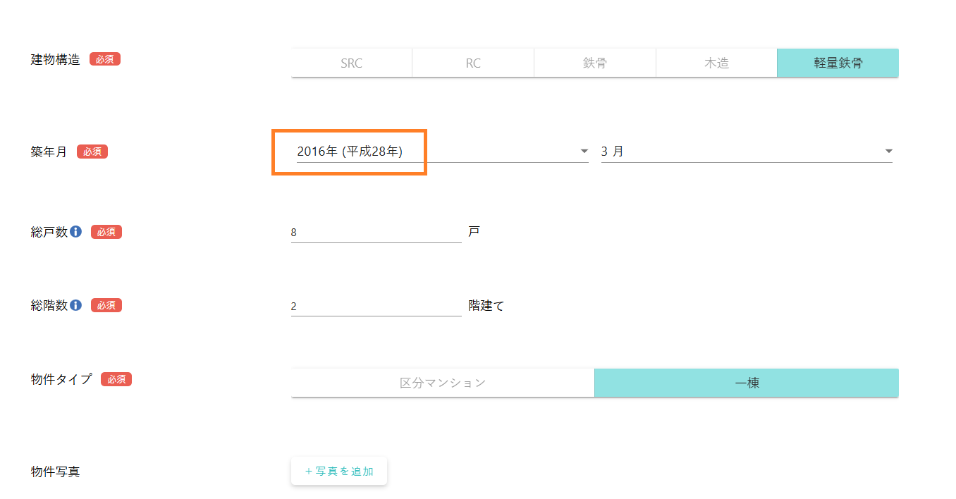 これまでは物件登録時の築年月項目に西暦のみが表記されていましたが、このたび和暦も併記されるようになりました。