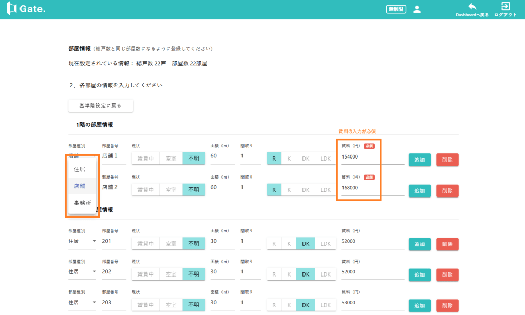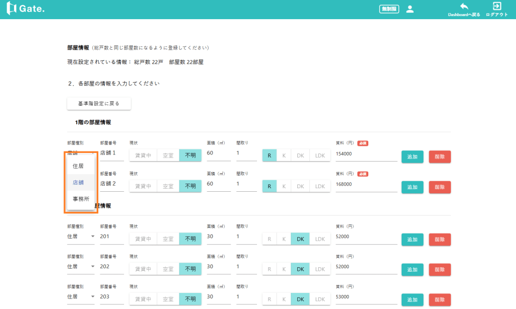 物件登録画面から各部屋情報を入力する際に、物件種別を「住居」「店舗」「事務所」の3つから選択できるようになりました。