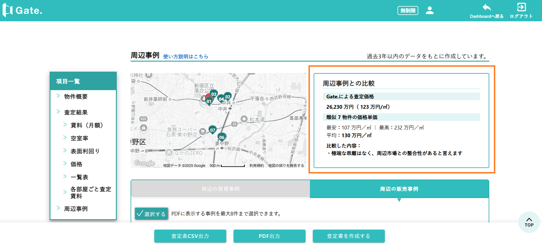 これによりGate.が査定した㎡単価を、選択した周辺事例の最安㎡単価・最高㎡単価・平均㎡単価と比較することが簡単になりました。